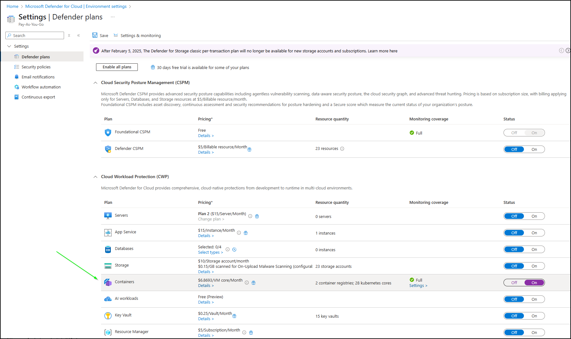 Today, if we wish to enable security scans on containers, we first need to go to “Microsoft Defender for Cloud”