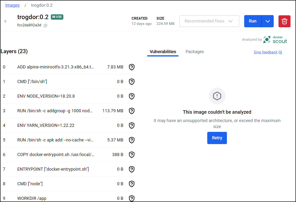 In Docker Desktop, we can pull up an image and click “Start Analysis” in the Vulnerabilities section for the Image