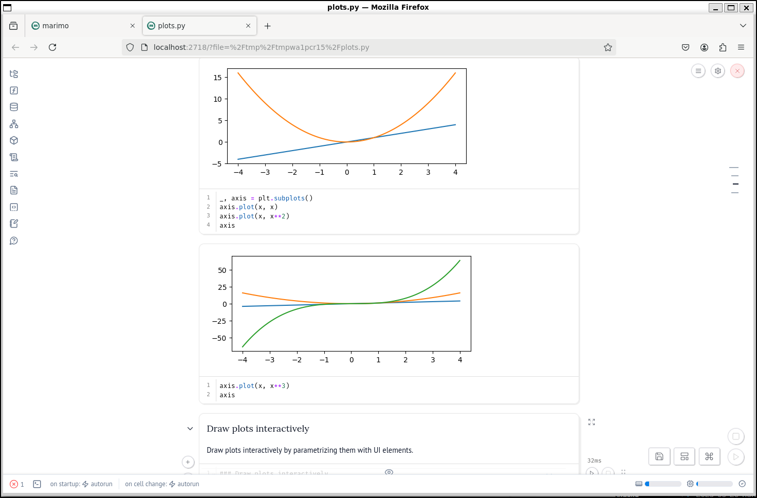 I next did a marimo edit and tried a plotting tutorial, but found it was missing a library. Thankfully, it told me what is missing (pip install numpy matplotlib)