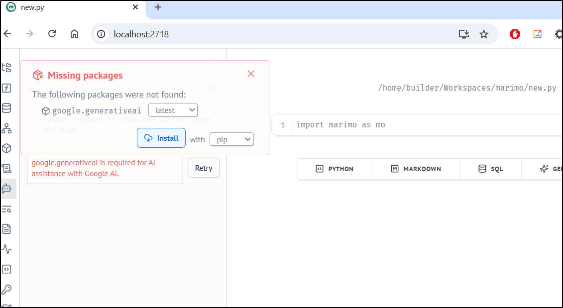 Today we explored Python notebooks with Marimo. We set it up in Python 3.8, the 3.9 via venv setup. We moved on to the AI plugin with Marimo tied to OpenAI as well as Google Gemini. Lastly, we use the AI integration to build a basic current time widget we could run with the run command.