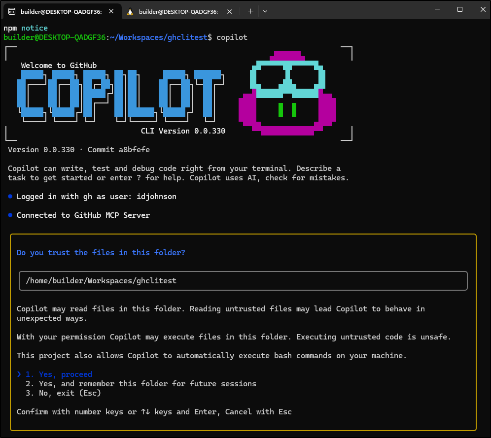 builder@DESKTOP-QADGF36:~/Workspaces/ghclitest$ npm install -g @github/copilot