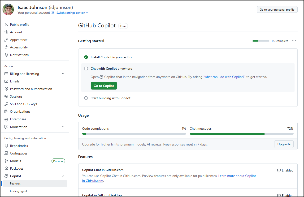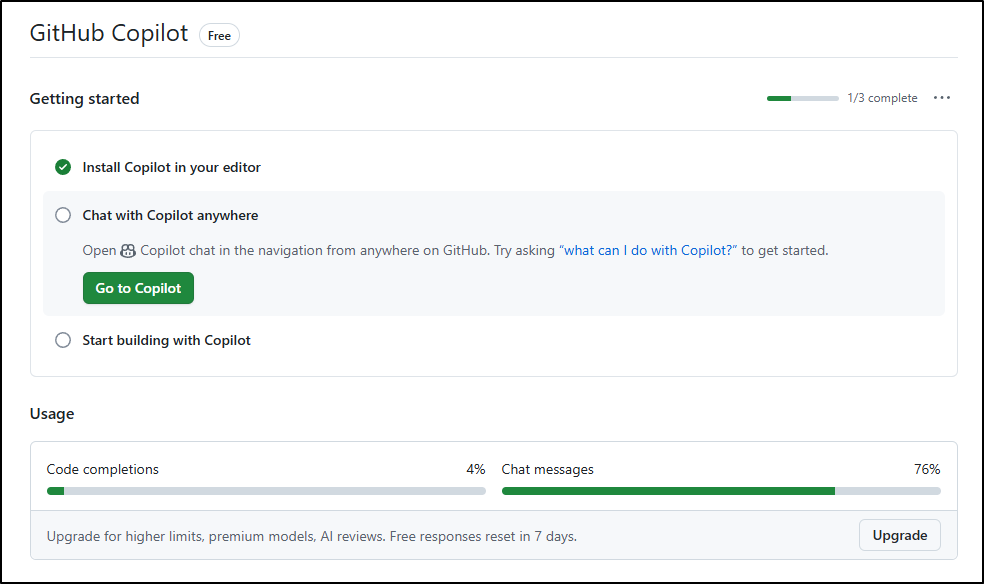 I really should have looked in my features beforehand as I don’t know what percentage was my front, but I can see my free tier for now is at 4% completions and %72 chat