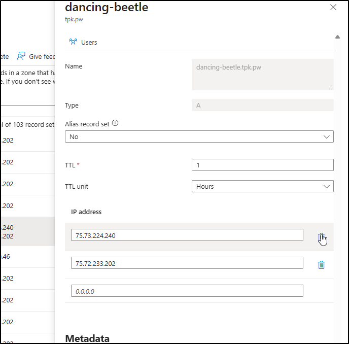 $ az account set --subscription "Pay-As-You-Go" && az network dns record-set a add-record -g idjdnsrg -z tpk.pw -a 75.72.233.202 -n dancing-beetle