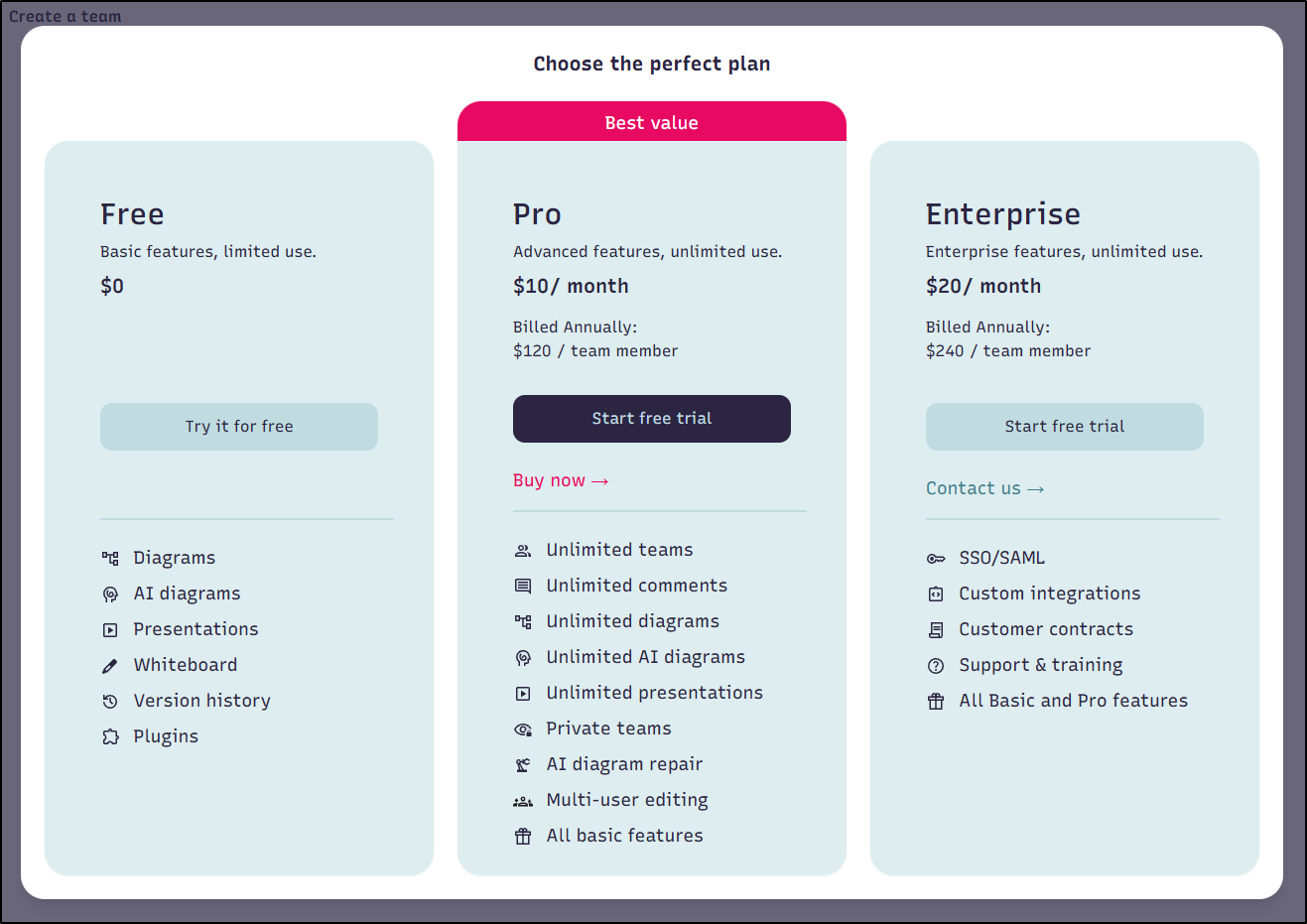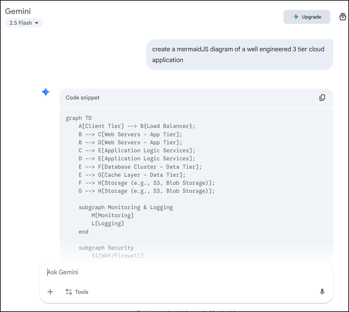 I was pleasantly surprised how well Mermaidchart’s UI works. I often have a MermaidJS diagram that just needs some adjustments. I’m pretty comfortable doing those by hand, but being able to drag and drop some boxes and connectors then get the code is really handy. I’m not sure I’ll use the AI features, but there are some real advantages there. Additionally, the commercial offering is just $10 so it would be in my price range if I did want to add the paid version to my tools.