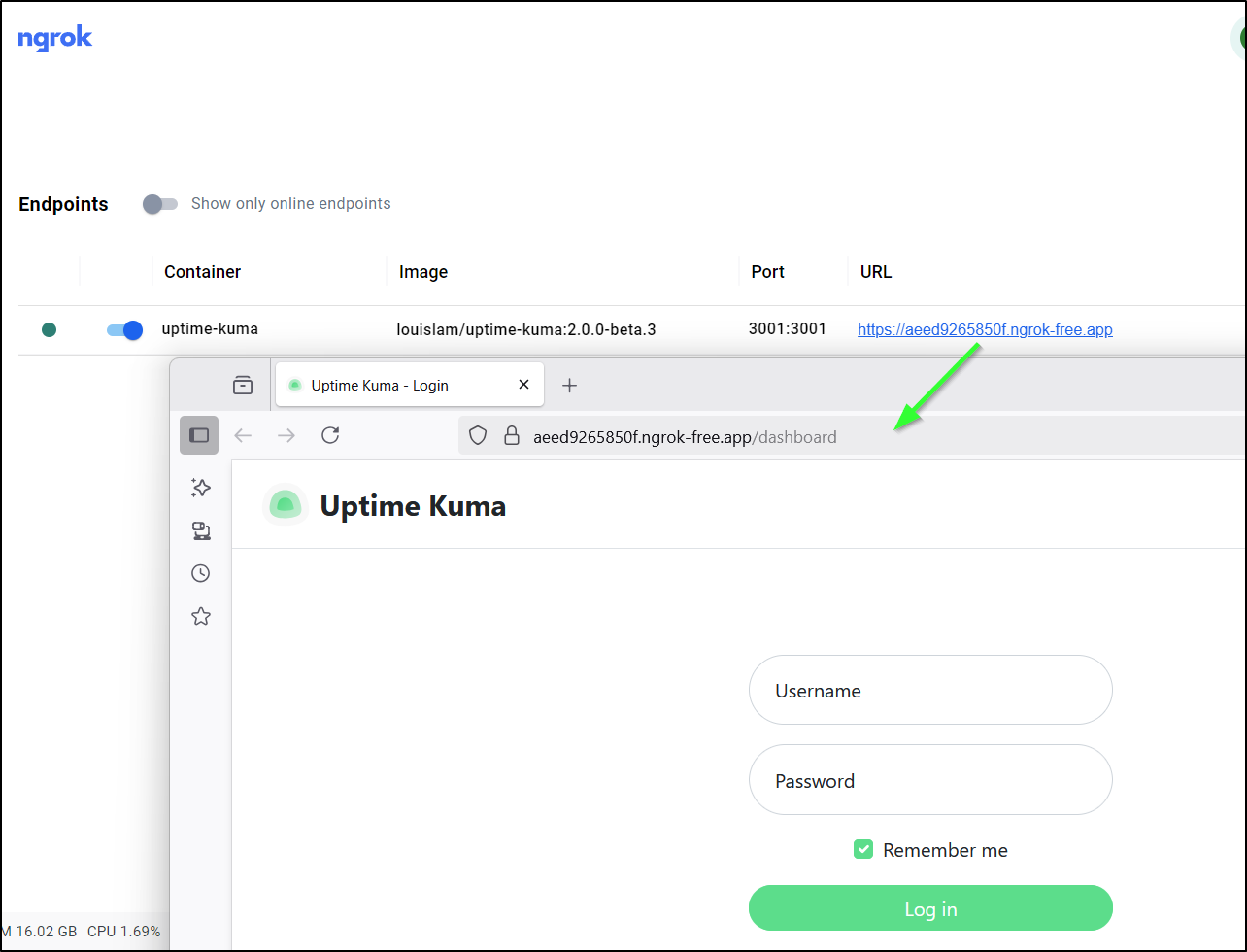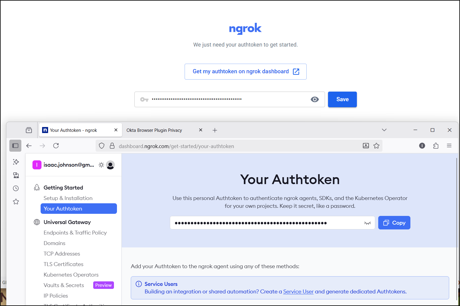 You can now see in the upper right that the Ngrok agent is running. We are in a new “Ngrok” menu that is on the left