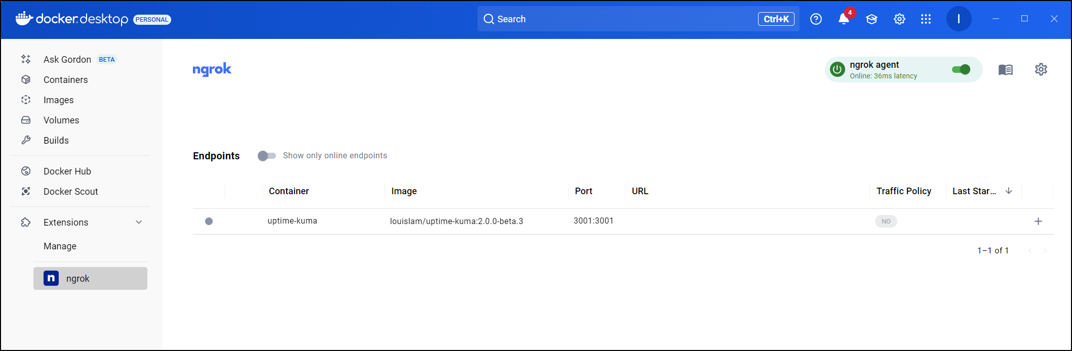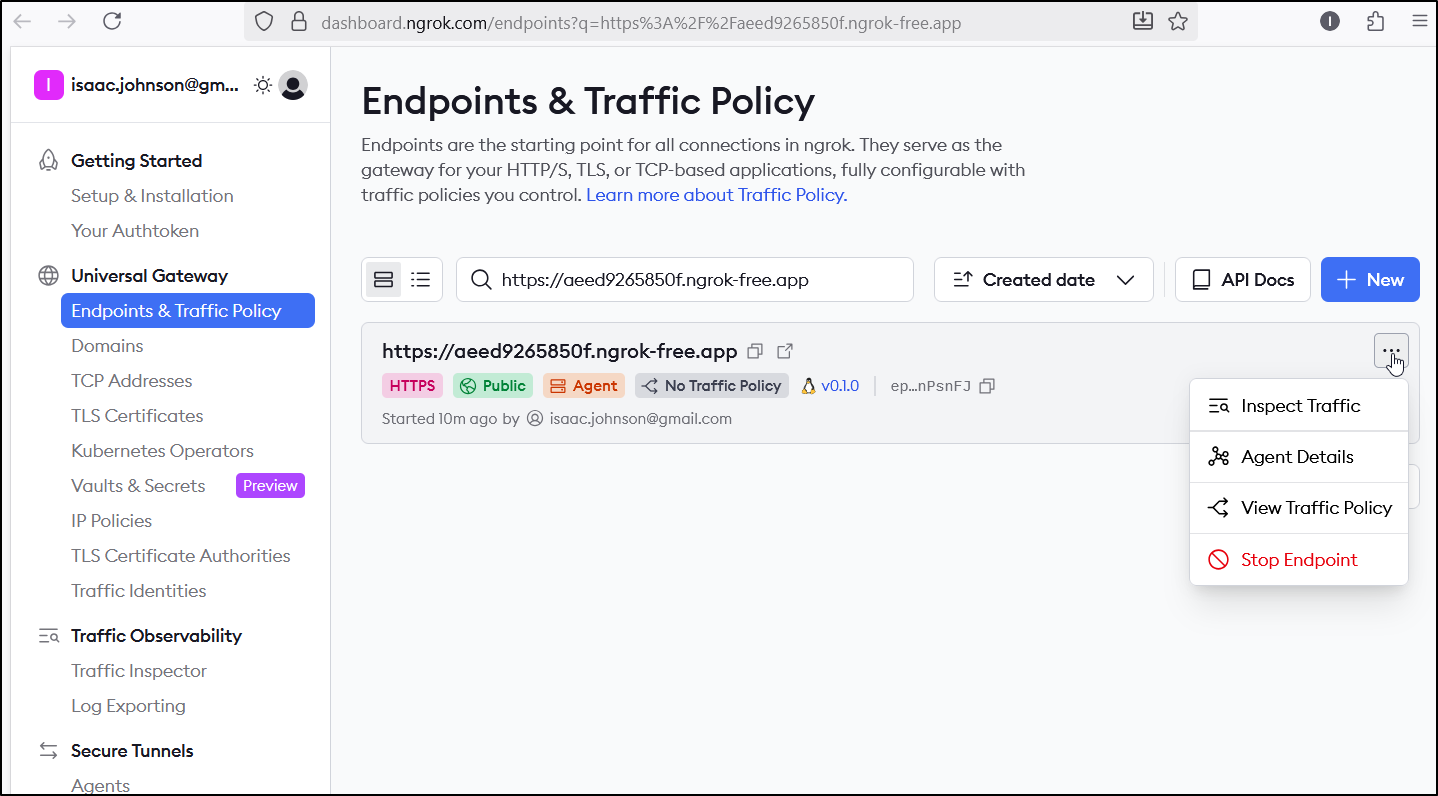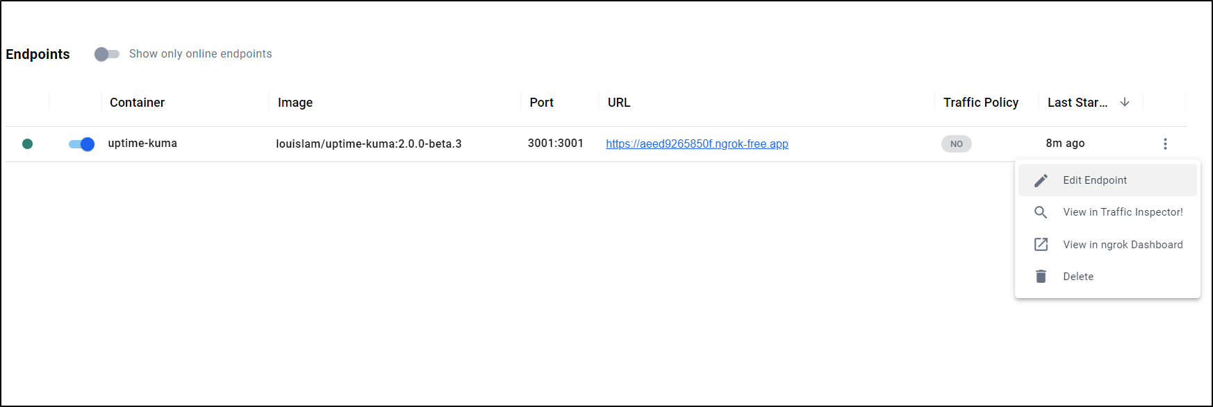 The “View in Ngrok Dashboard” takes us to our service in the Ngrok Dashboard and is an easy way to pause or stop our endpoint