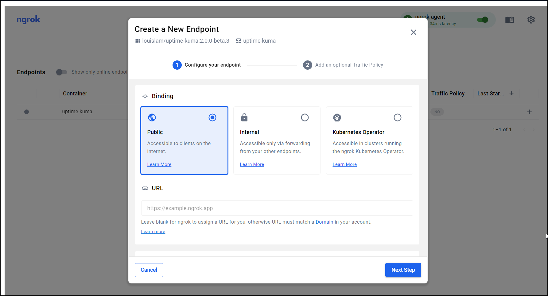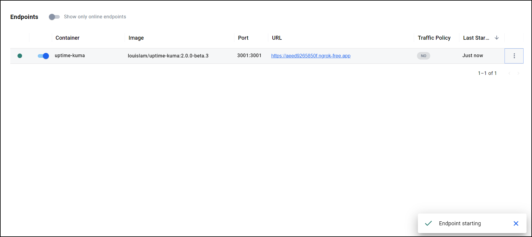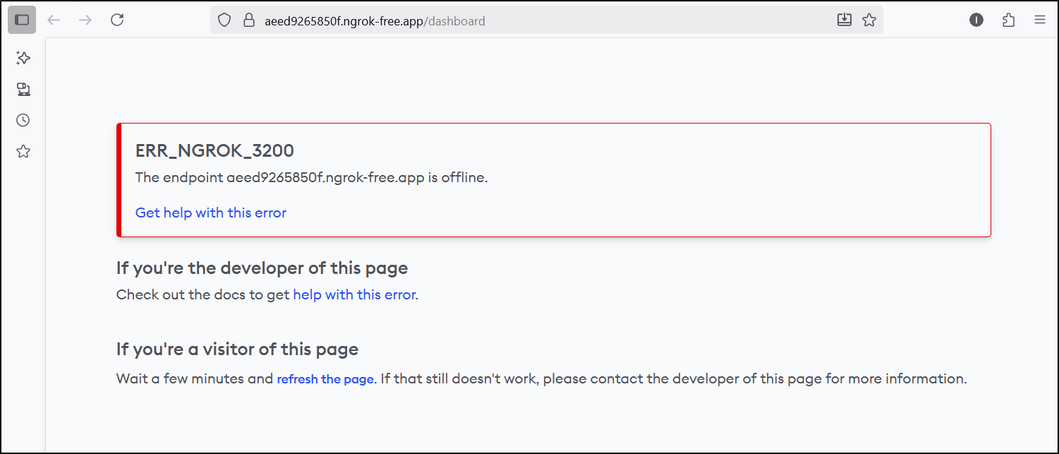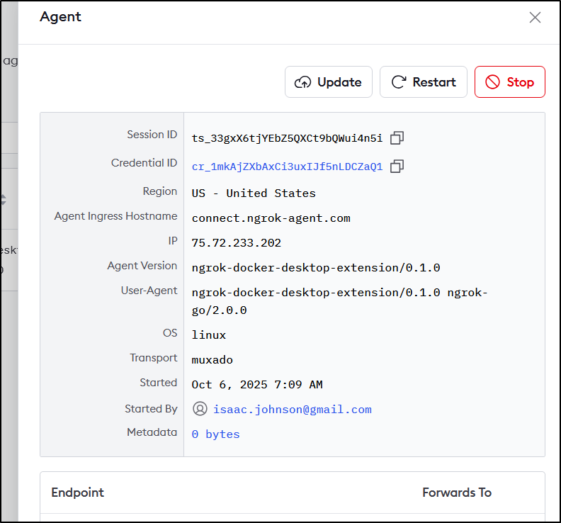 The “View in Ngrok Dashboard” takes us to our service in the Ngrok Dashboard and is an easy way to pause or stop our endpoint