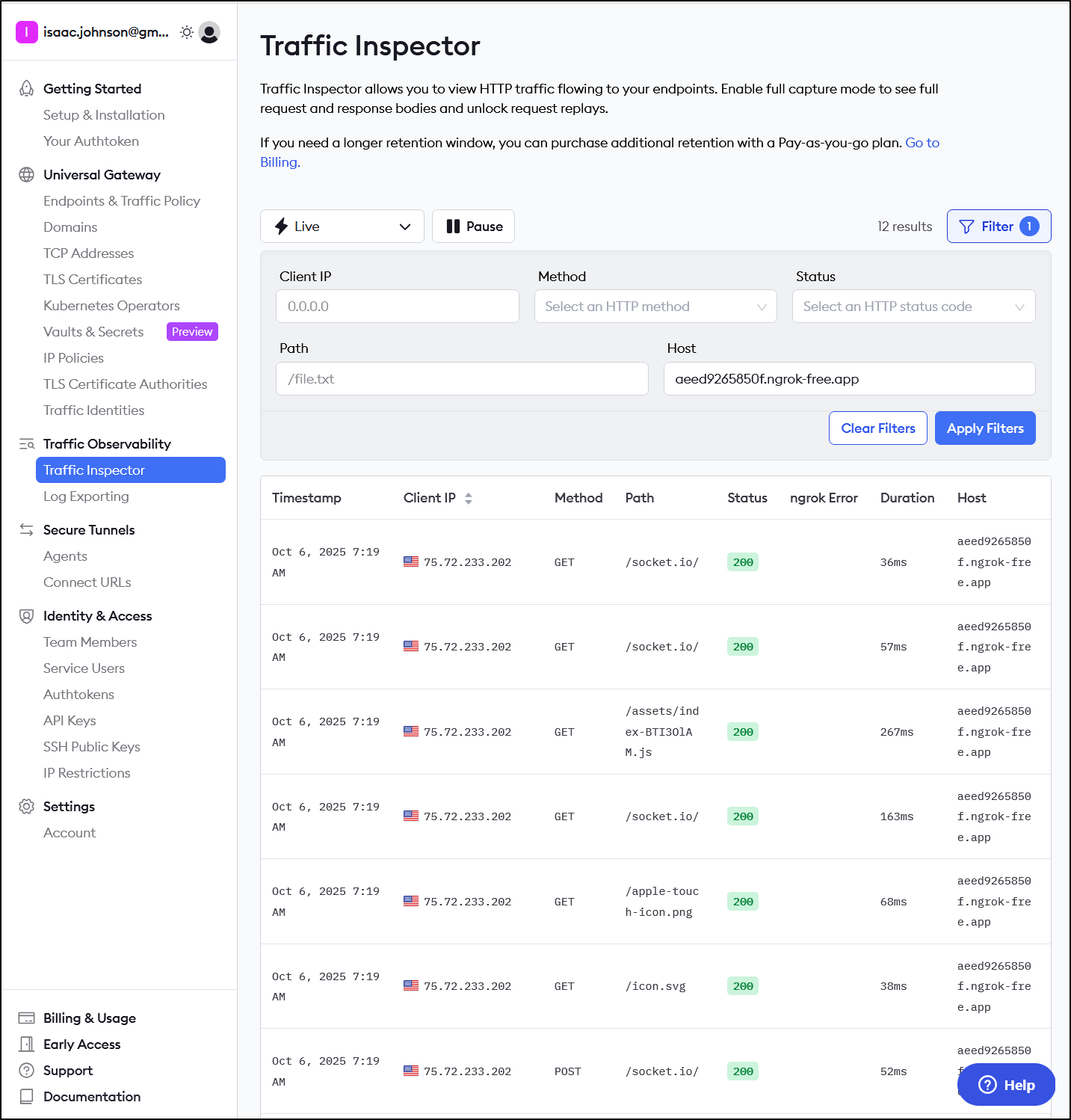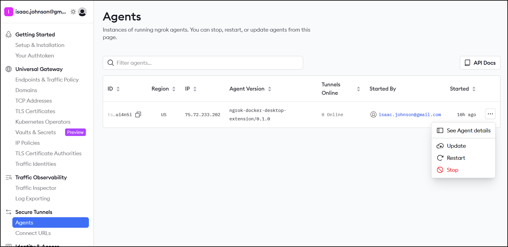 In the NGrok Dashboard, we can see our agents in the Agents pane
