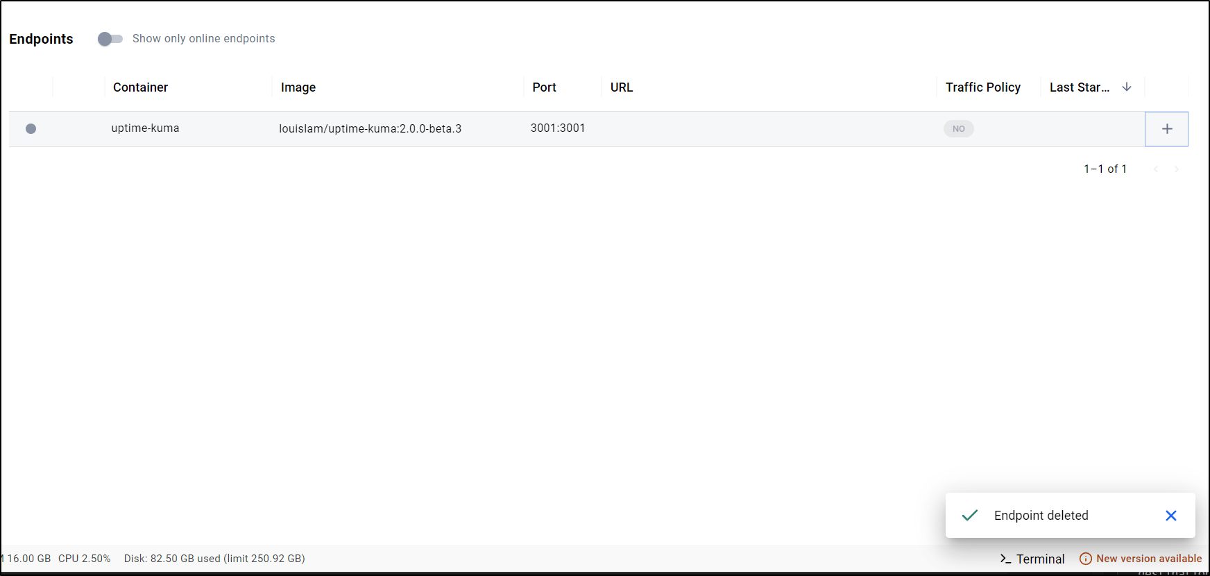 And, of course, if I “delete” it just removes the endpoint - it does not affect the running container or remove it from the list