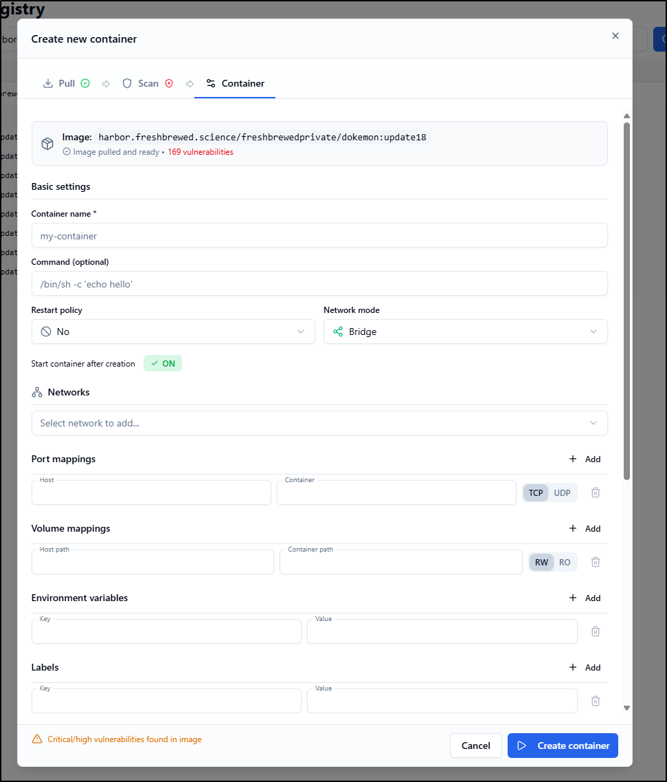 I can enable container scanning on pull and pick the scanner to use (by default off)