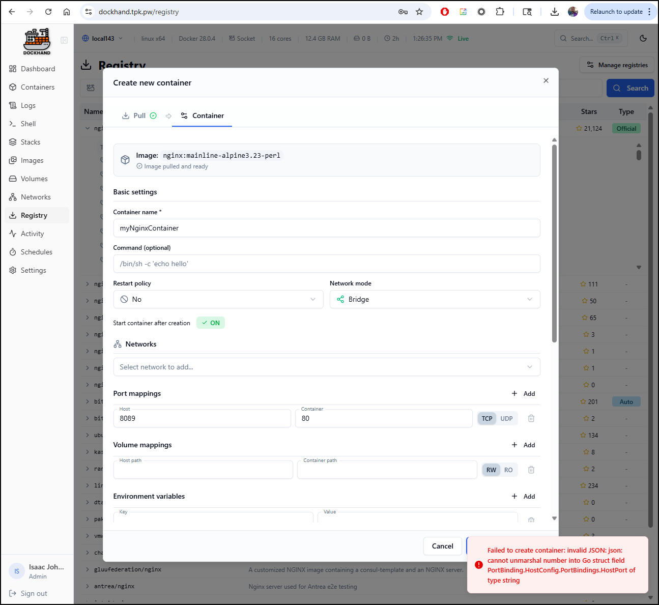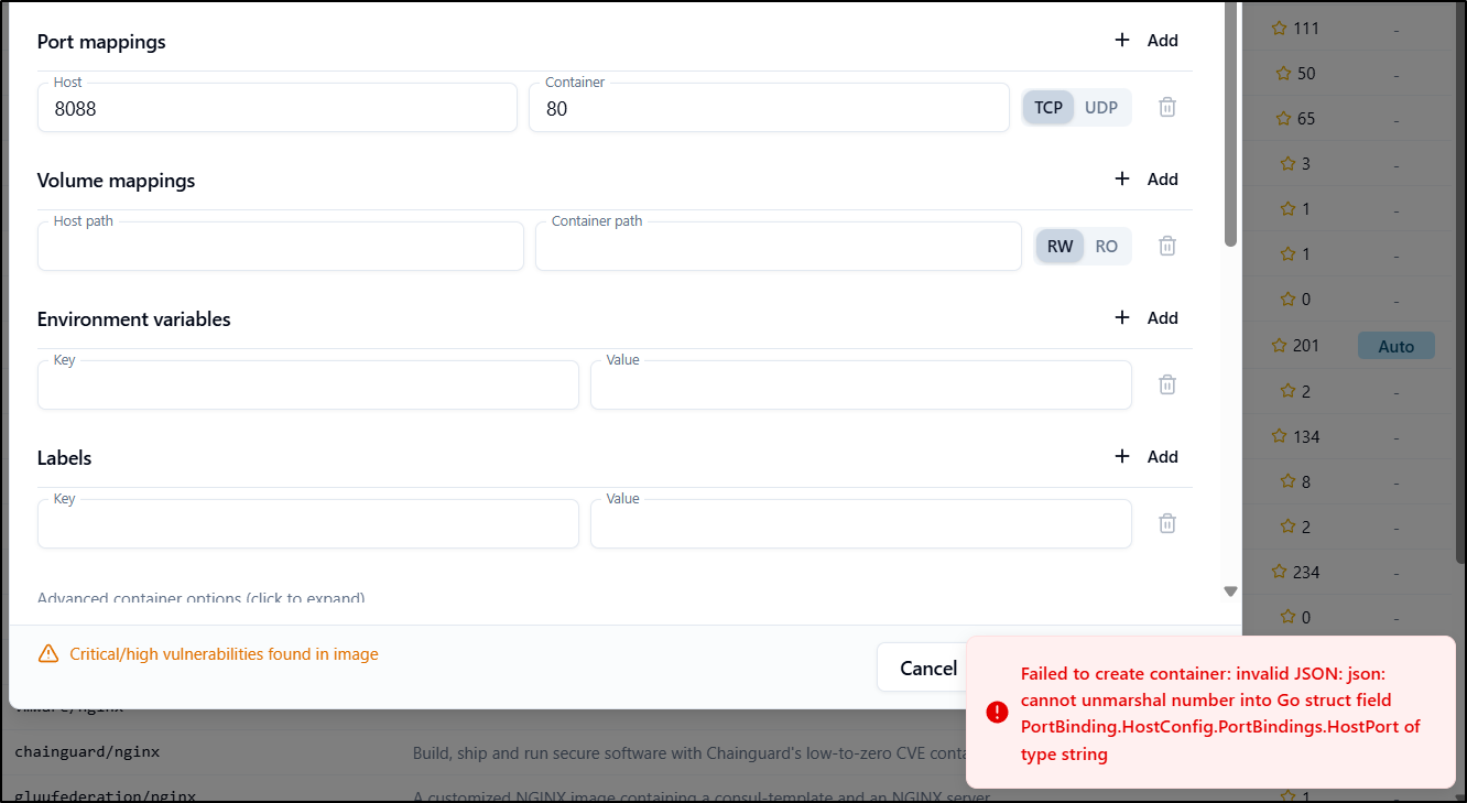 We can “create” a stack here. I will test my luck and do Nginx again with a port mapping