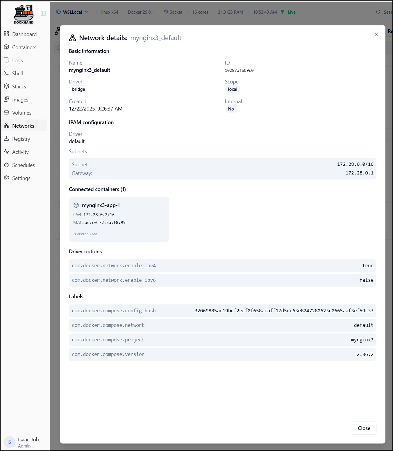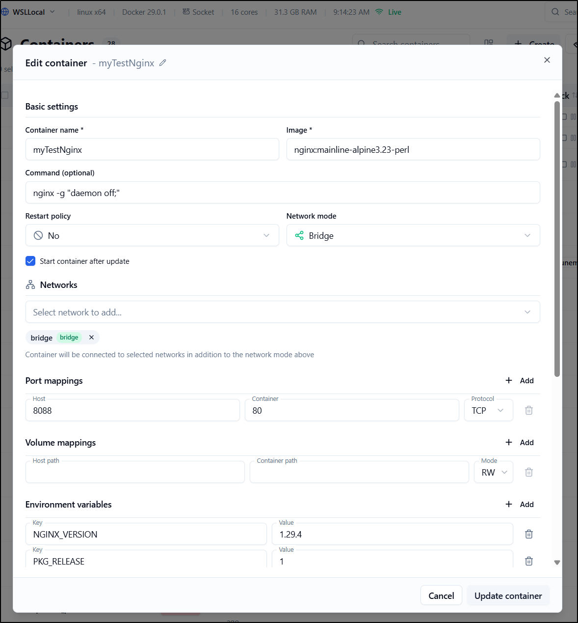 That launched just fine and I can see a 403 on root (it is a blank NGinx so i expect that - the fact we see “nginx/1.29.4” is the tell it is functioning)