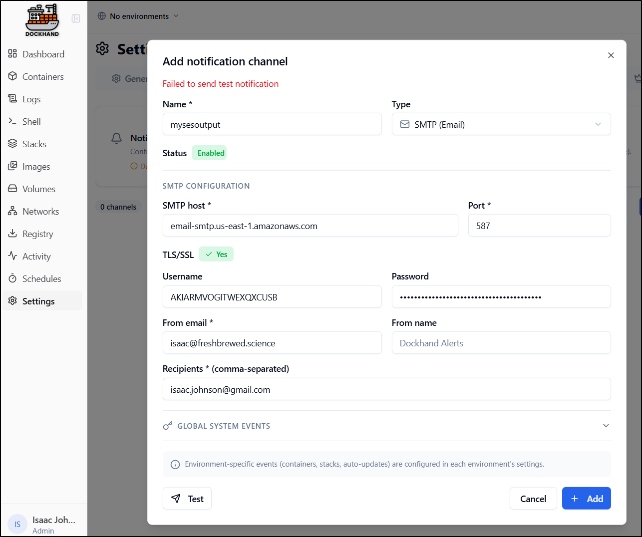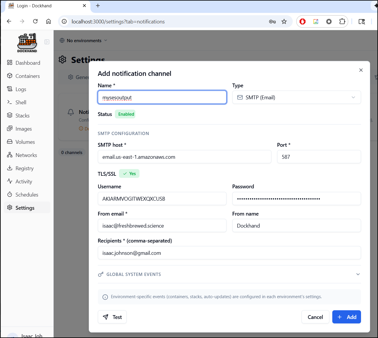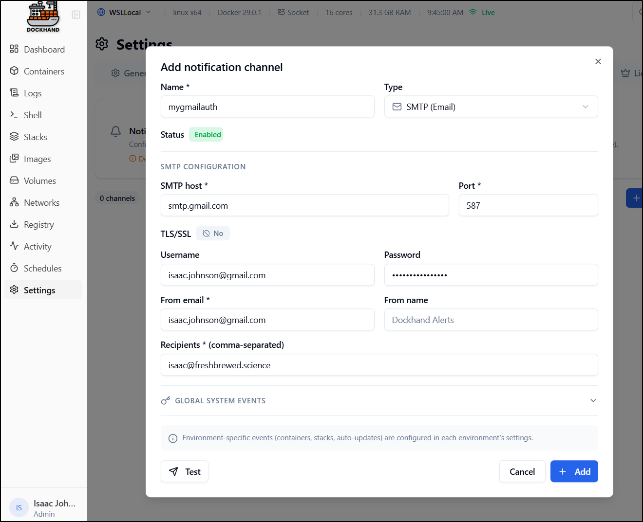 For Notifications, we can choose SMTP (email) or Apprise (Webhooks)