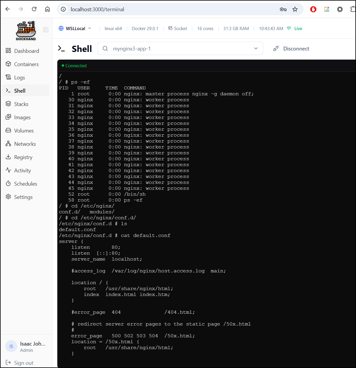 I can hop into the Nginx container, for instance and see where the default HTML folder is