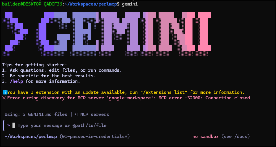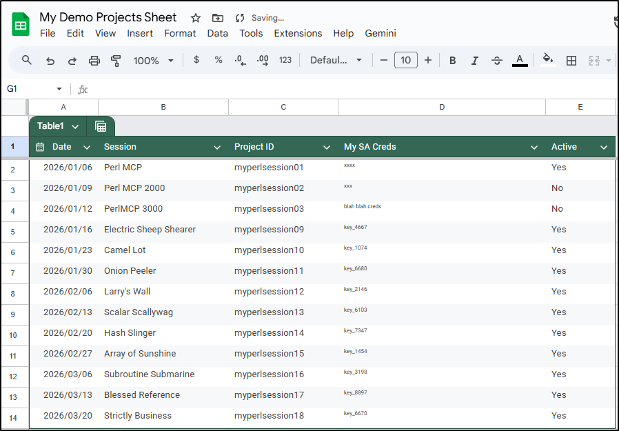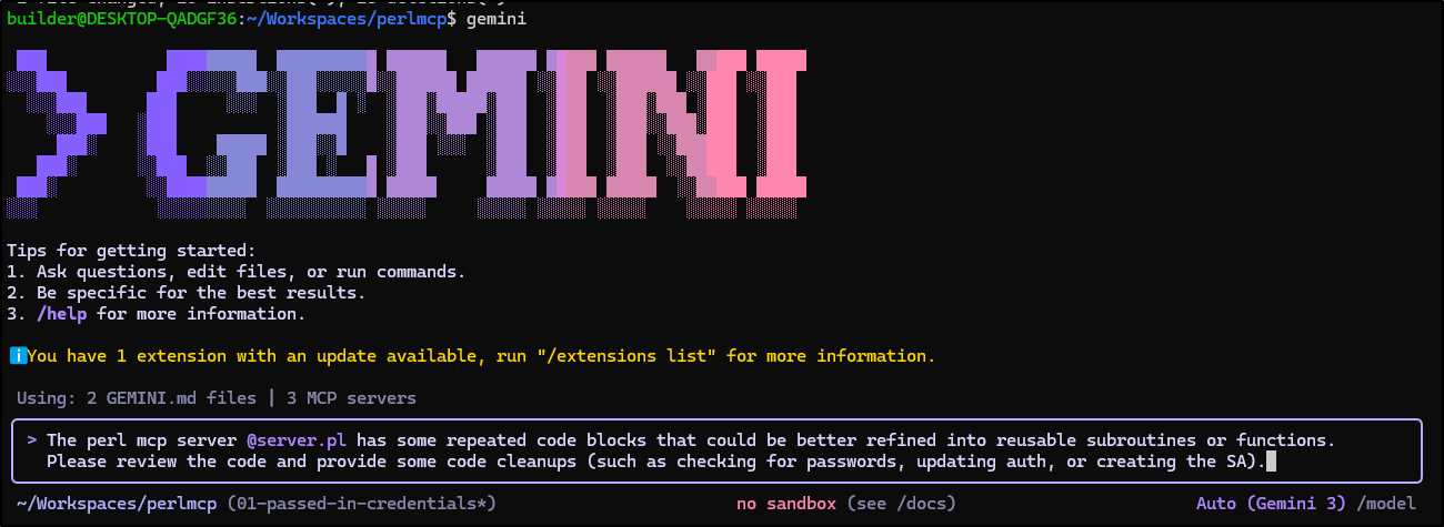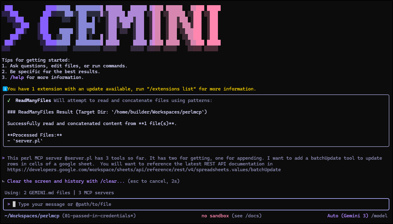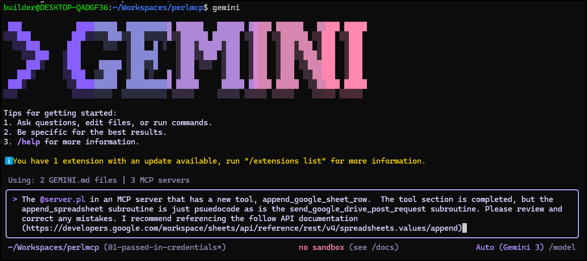 Earlier this week I posted my first article on PerlMCP which I pushed to Codeberg as a version1.0 tag. That code provides a Perl-based MCP server of type httpStreamable tied to a fixed GCP Service Account credential and just protected by a rotatable password.
