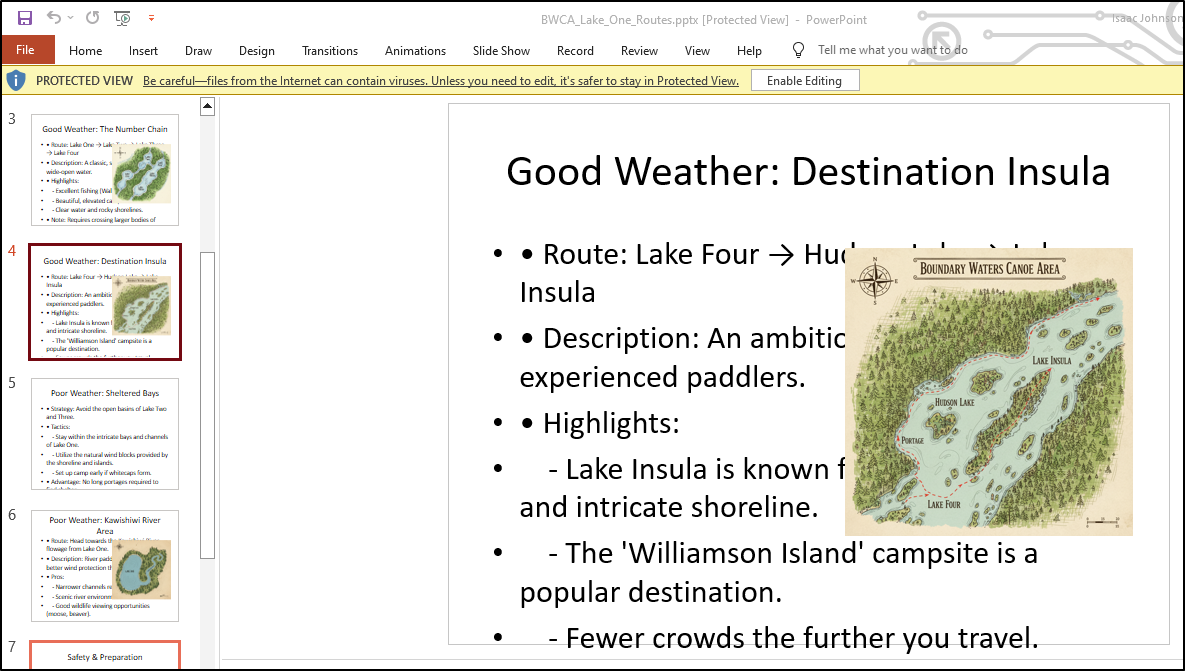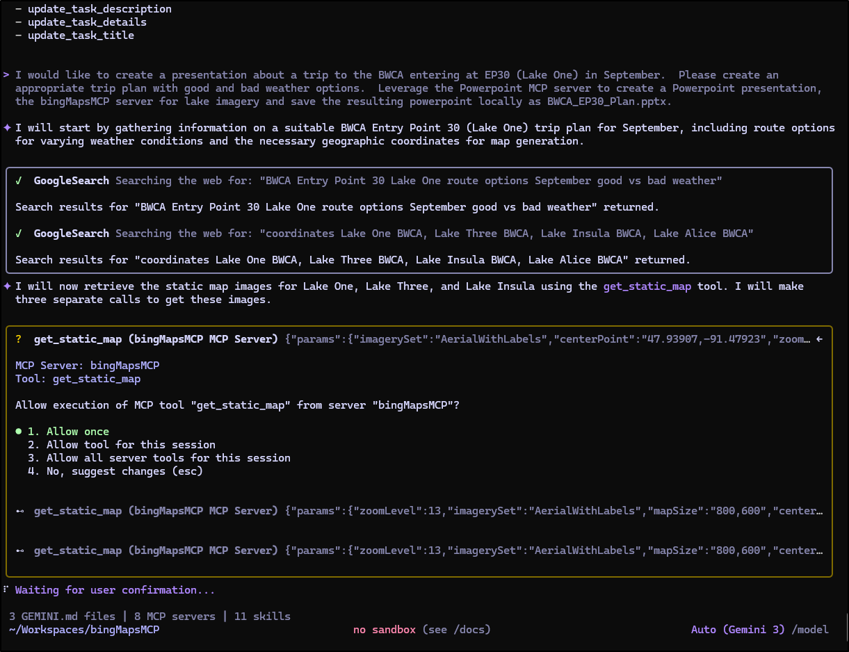 In making a BWCA route, I found the general “create a map” or image from Nanobanana was rather pointless - they bared no resemblance to the lakes in question. This brought me to a Google Maps MCP server which did a fantastic job. Yes, it took a bit of legwork to create a proper Service account with permissions, but it was worth it for the proper images.