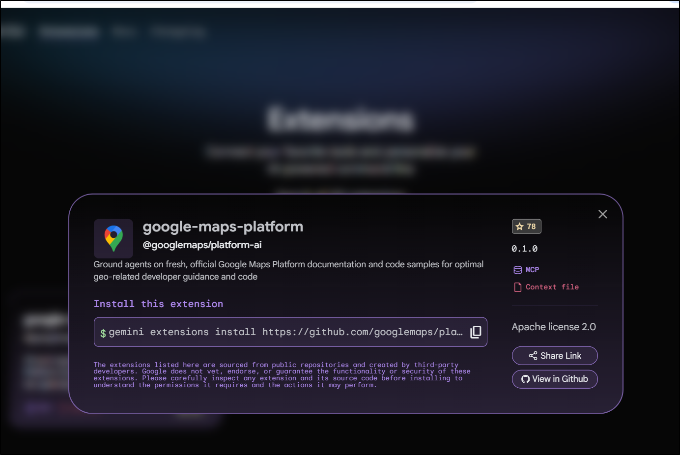 The extension you are about to install may have been created by a third-party developer and sourced from a public repository. Google does not vet, endorse, or guarantee the functionality or security of extensions. Please carefully inspect any extension and its source code before installing to understand the permissions it requires and the actions it may perform.