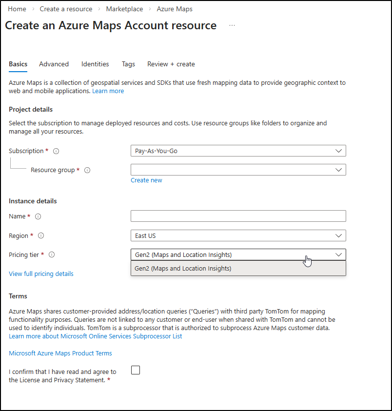 I’m a little more iffy on this Azure Maps because in one way, it says that it costs me US$4.50 for under 500k maps and another it says 5000 map tiles are free. Maybe it means it’s just a flat rate of US$4.50 a month plus transaction costs for creator?