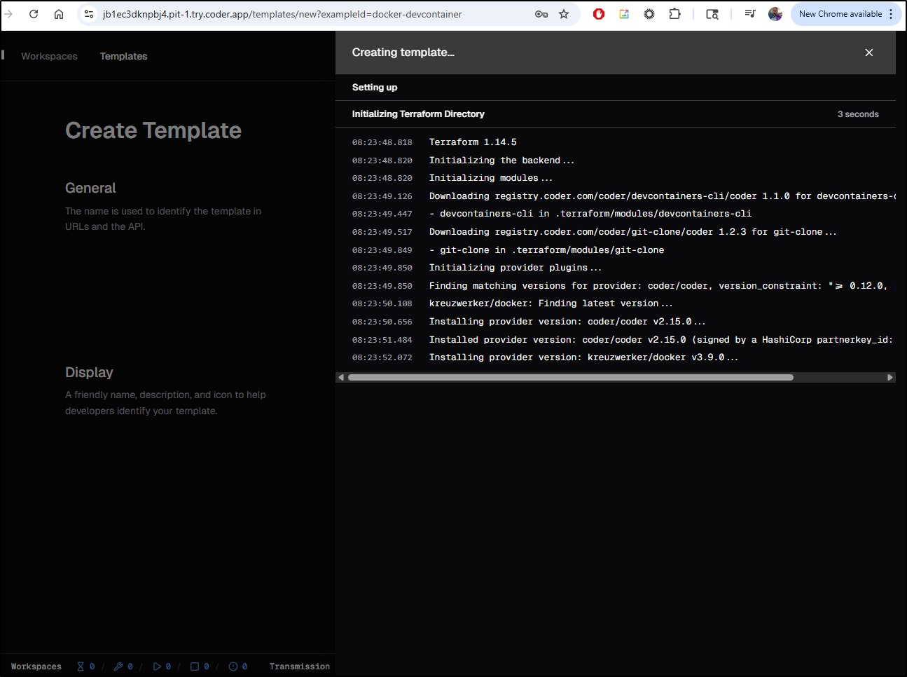 I came back after a day (as the cluster control plane was misbehaving and I didn’t want to assume this was Coder’s fault)