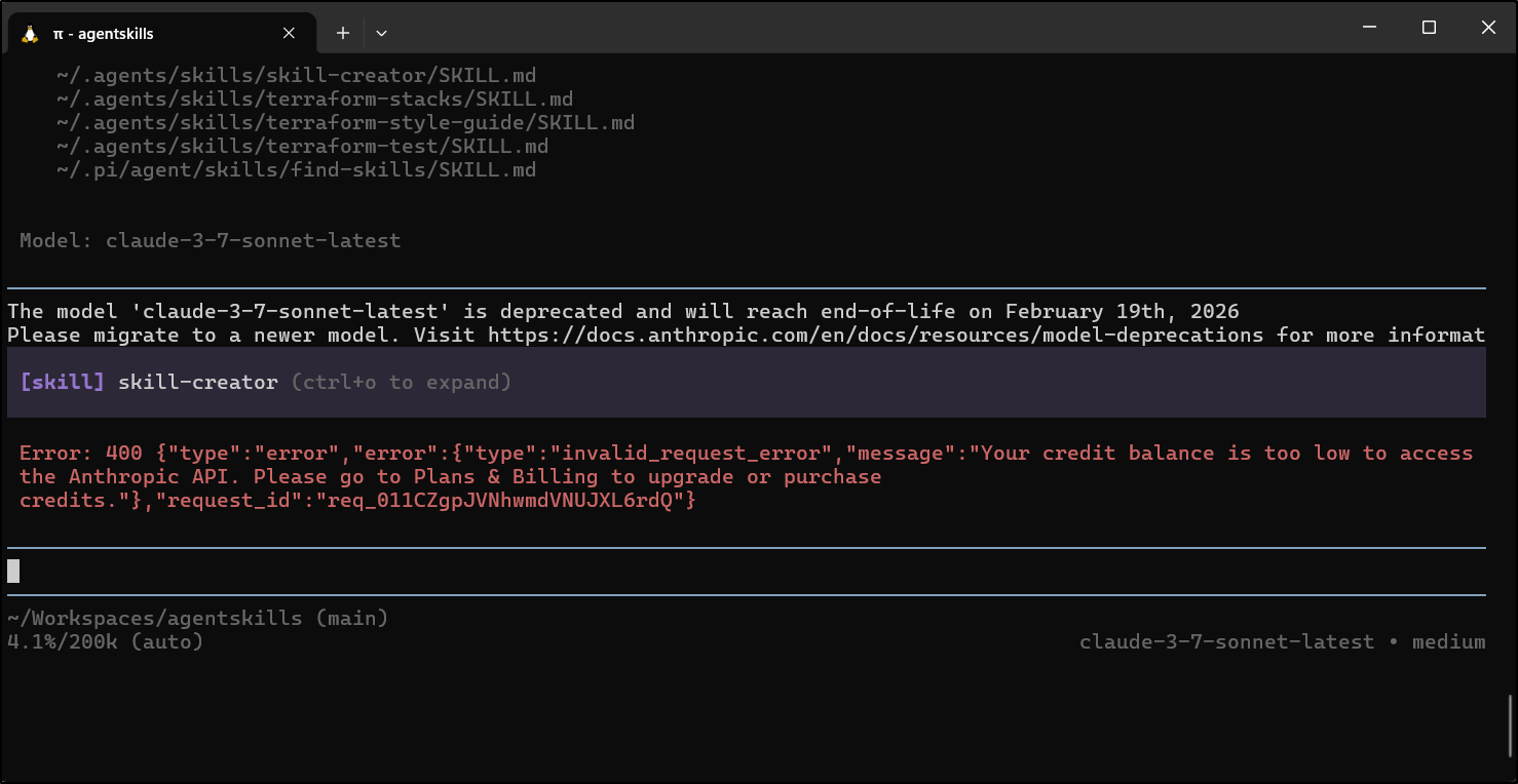 I spent about US$0.35 making the Perl skill and about US$2.30 with Claude Code making the helm chart one. Both used the Anthropic “skill builder” skill. Assuming the quality is similar, I might use Pi from here on out. However, as a “free tier” user that pays per token, the money factor might really be my underlying driver.