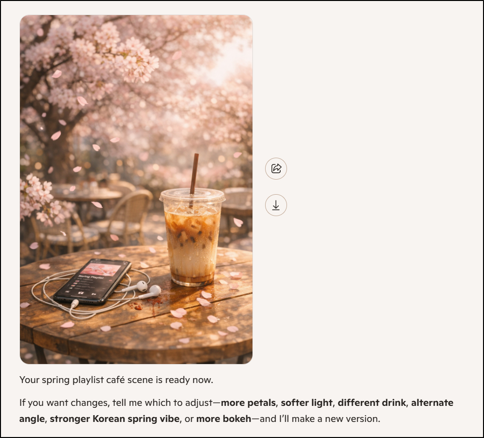 aesthetic spring playlist scene, a cozy outdoor cafe table under full blooming cherry blossom trees, pink petals gently falling, a smartphone with earphones placed on a wooden table, iced coffee with condensation, warm sunlight shining softly, soft shadow, dreamy and romantic mood, pastel color tones, ultra realistic, cinematic lighting, shallow depth of field, natural composition, Korean spring vibe, 50mm lens, high detail, bokeh background