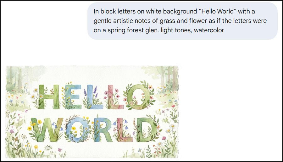 “In block letters on white background “Hello World” with a gentle artistic notes of grass and flower as if the letters were on a spring forest glen. light tones, watercolor”