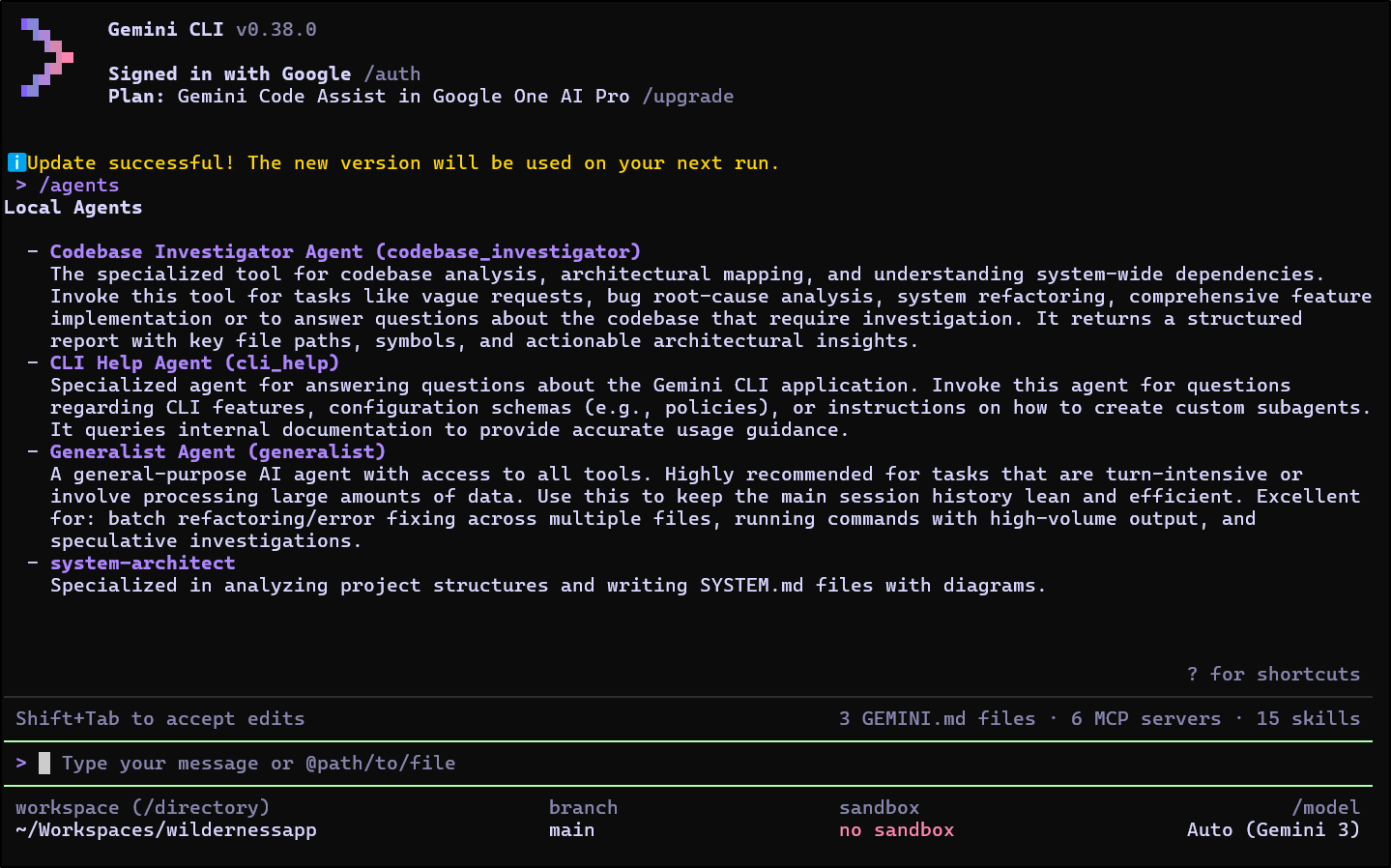 (venv) builder@DESKTOP-QADGF36:~/Workspaces/wildernessapp$ mkdir -p ~/.gemini/agents