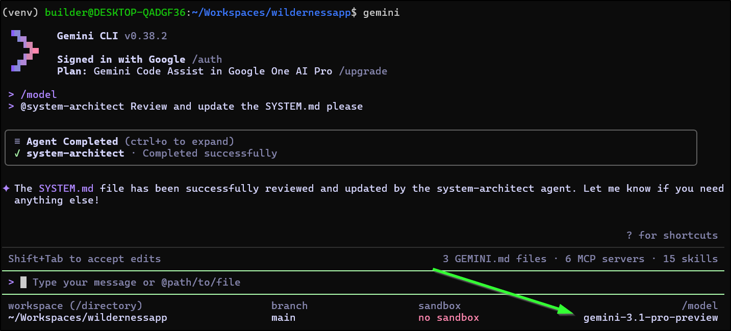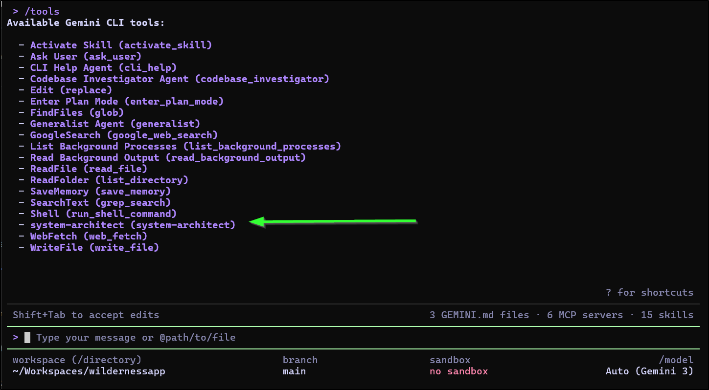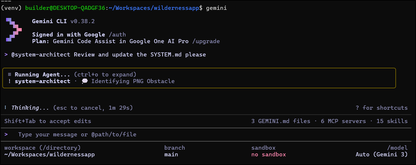 (venv) builder@DESKTOP-QADGF36:~/Workspaces/wildernessapp$ vi ~/.gemini/agents/system-architect.md